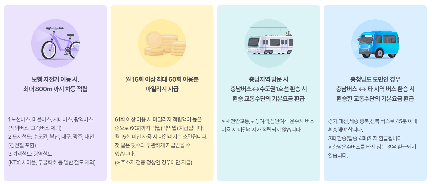 - 충남지역 방문 시 충남운수사 환승요금은 마일리지로 적립됩니다.